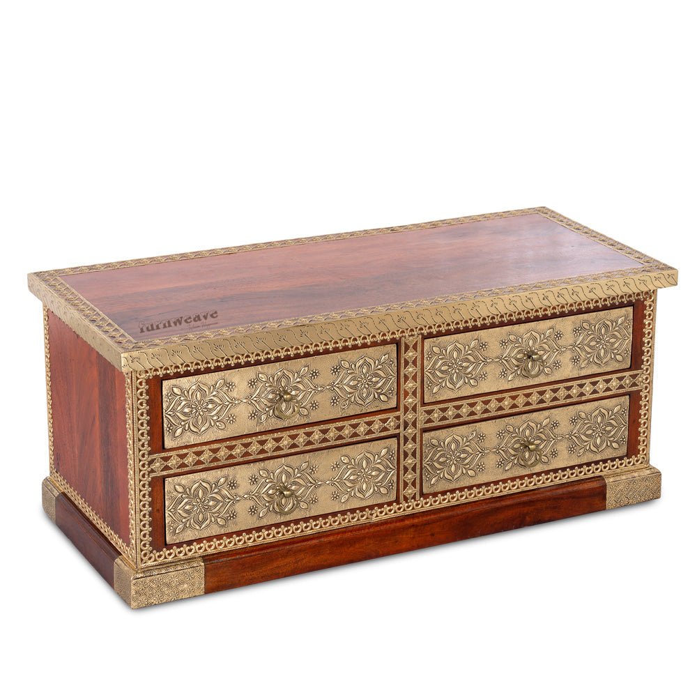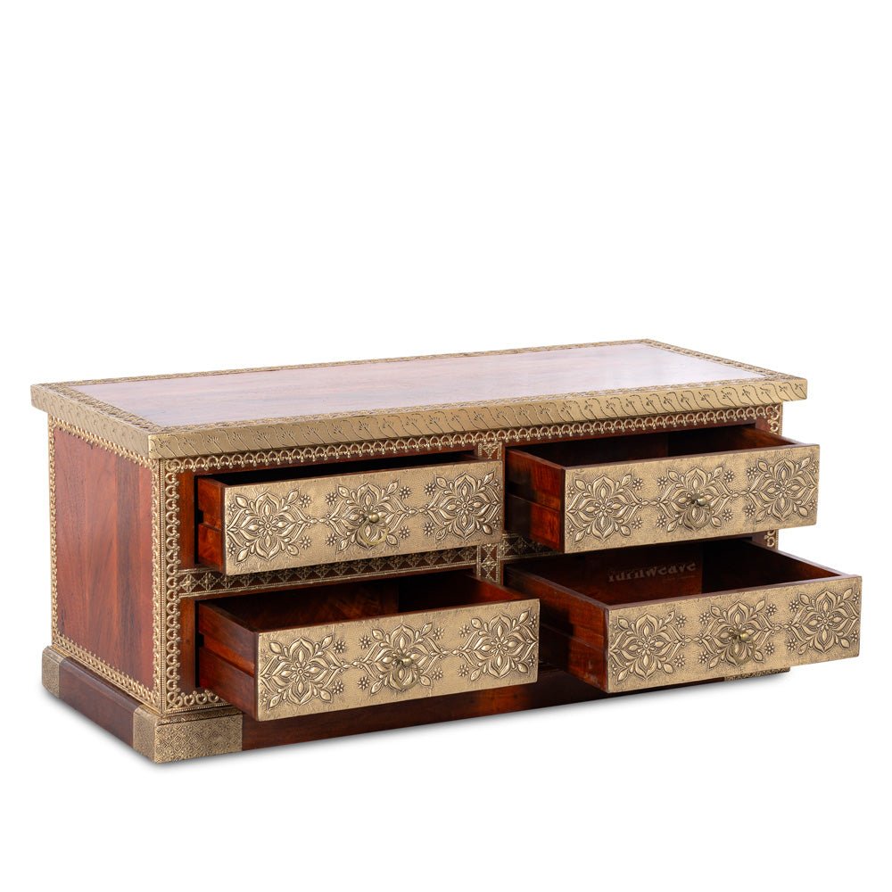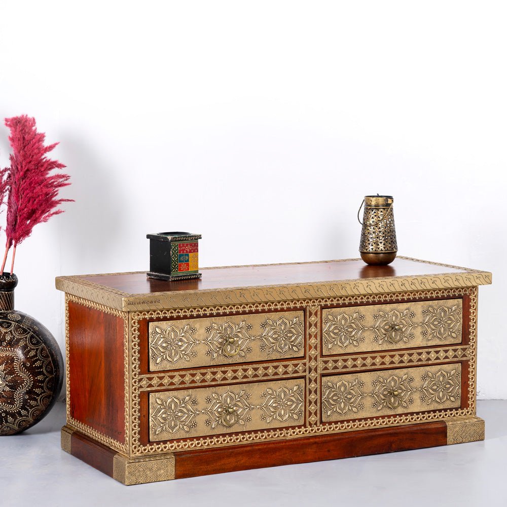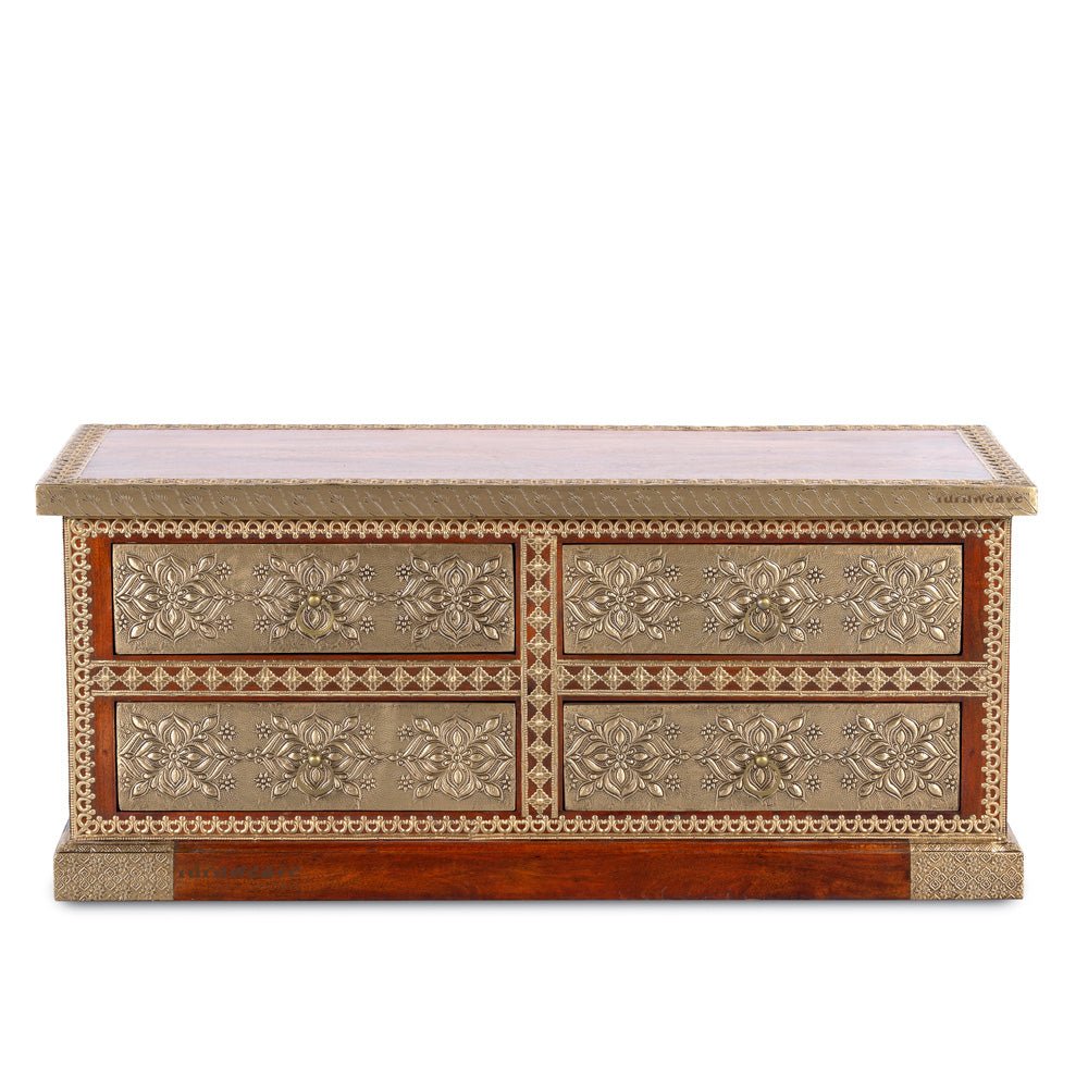 Add a touch of heritage luxury to your interiors with this Sheesham Wood Chest of Drawers featuring 4 spacious drawers and brass-fitted detailing. Crafted from solid Sheesham wood, this chest showcases intricate brass accents that elevate its traditional appeal while maintaining everyday functionality.
