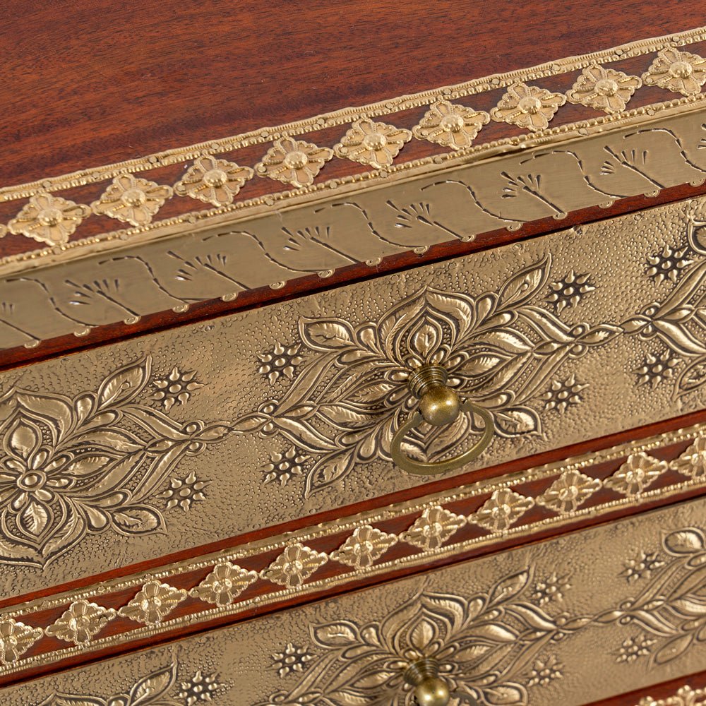 The sturdy wooden frame ensures long-lasting durability, while the smooth-glide drawers offer ample storage for clothes, linens, or essentials. Its rich finish and ornate brass work make it a statement piece for bedrooms, living rooms, or premium boutique spaces.