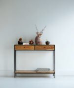 Bring modern elegance and smart storage to your home with this Sheesham Wood Entryway Console Table with 2 Drawers and Open Shelf. Expertly crafted from premium solid sheesham wood, this console table showcases rich natural wood grain paired with a sleek metal base for a contemporary, industrial-inspired look.