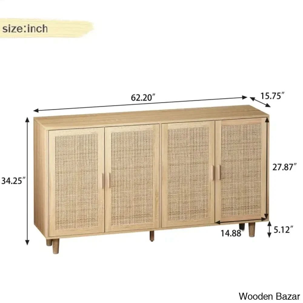 Enhance your home with this Solid Wood Cane Sideboard in a natural finish, featuring 4 cane doors with sturdy iron handles. Crafted from premium solid wood with handwoven cane panels, this storage cabinet offers spacious compartments for dining essentials, décor, and daily storage. The natural wood tone and iron hardware create a perfect blend of rustic and modern design.