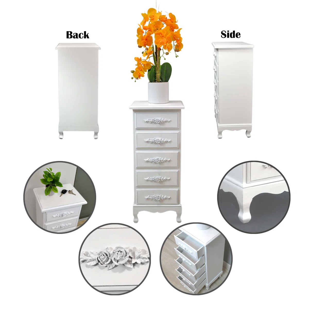Upgrade your space with this Solid Wood Chest of Drawers featuring 5 spacious drawers in a white finish. Crafted from durable solid wood, this dresser offers organized storage for clothes, accessories, and essentials while adding a clean and elegant look to your home décor.