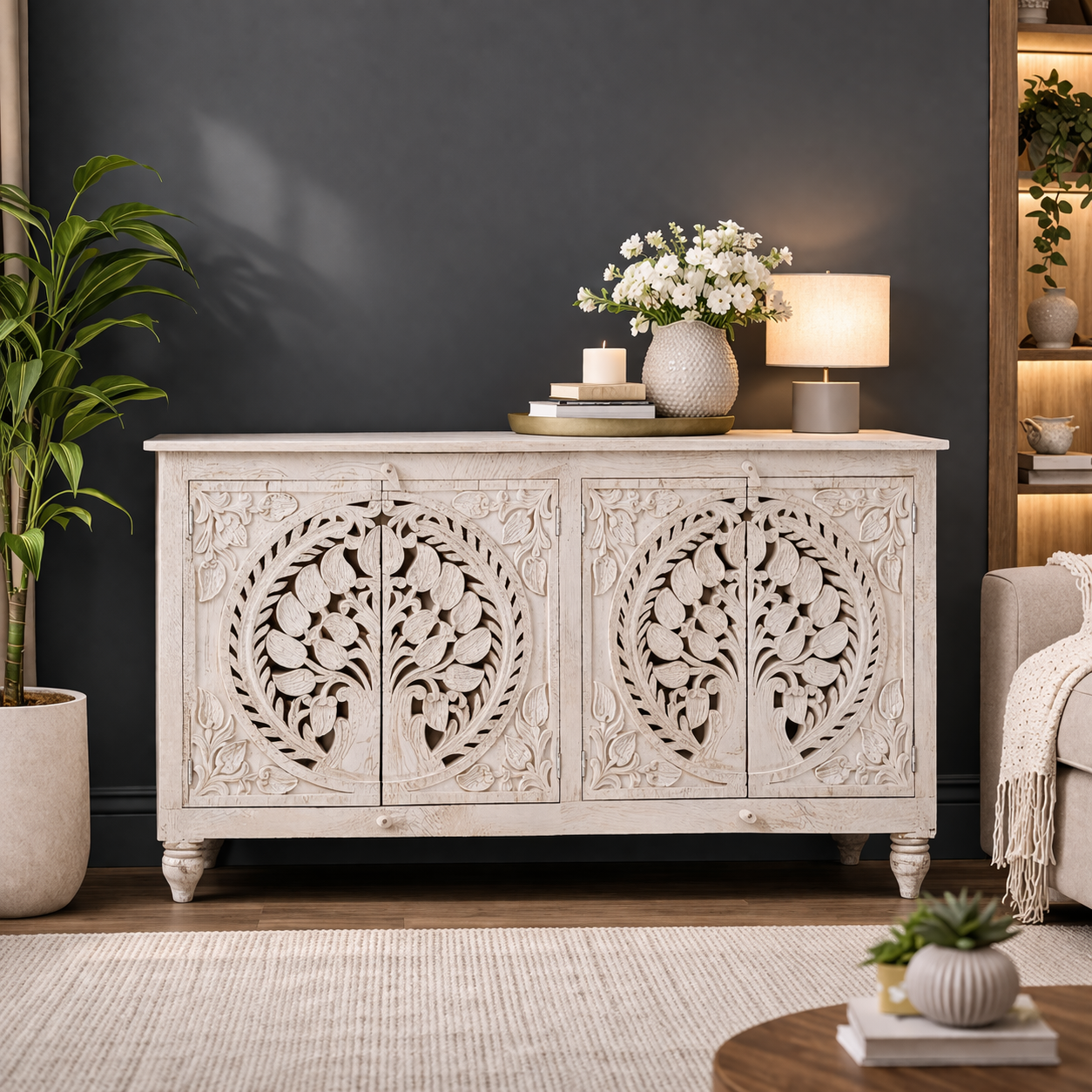 Solid Wood Hand Carved Sideboard 4 Door – Off White Finish Storage Cabinet