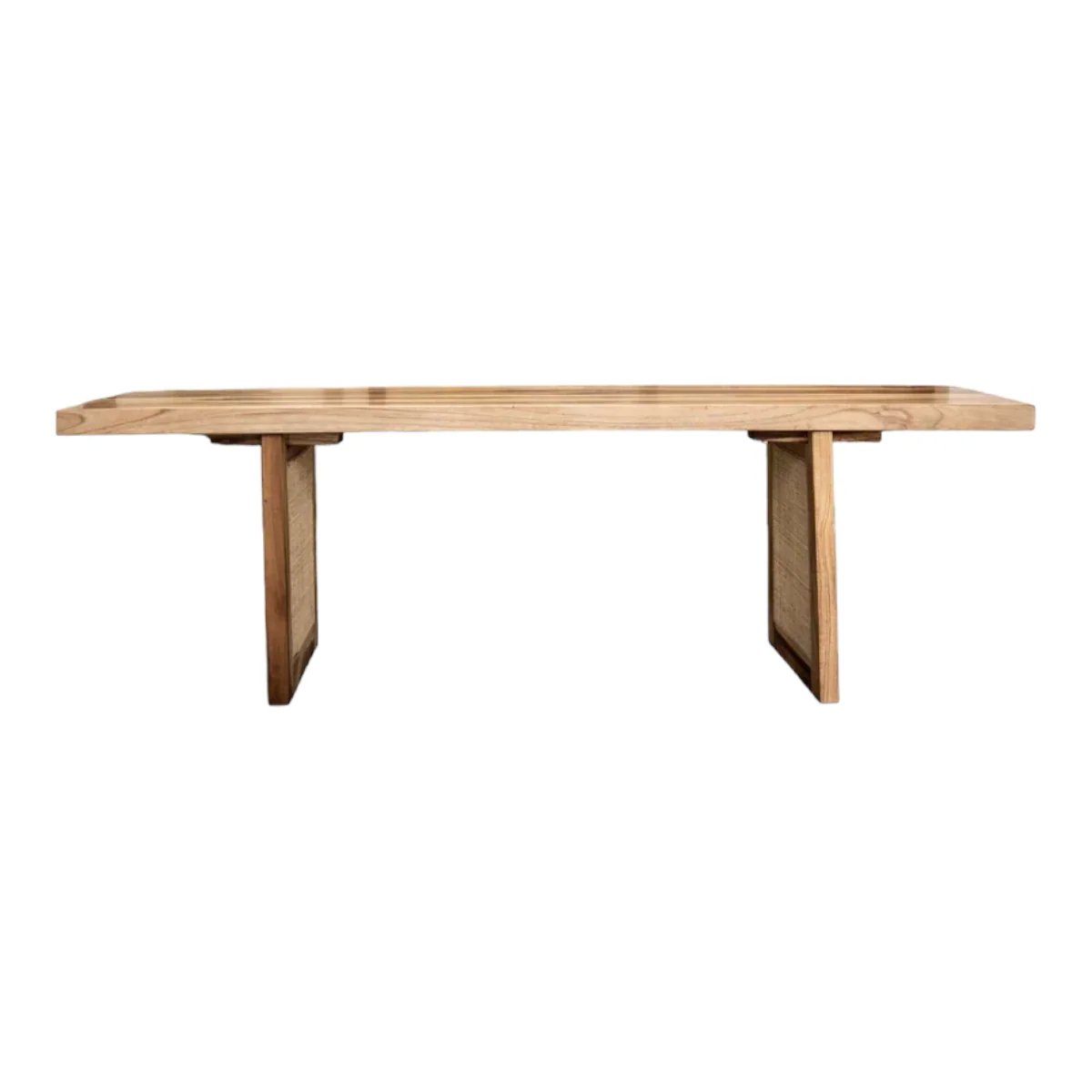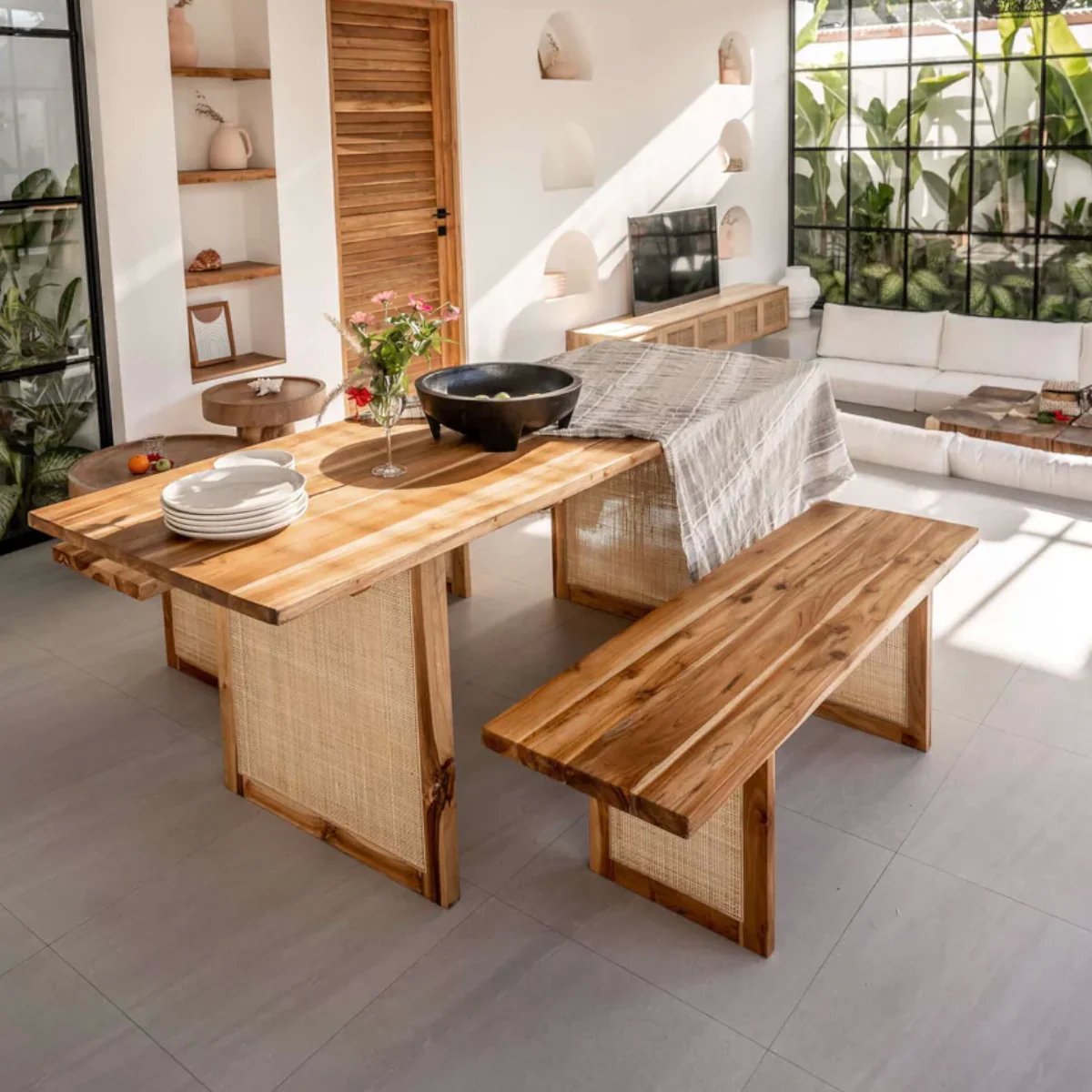 Teak Wood Cane Dining Table 6 Seater with 2 Bench and 2 Chairs – Natural Finish Dining Set