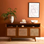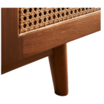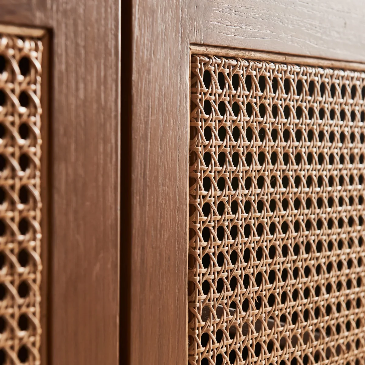 Teak Wood Rattan Media TV Unit – 3 Door Open Shelf Natural Finish