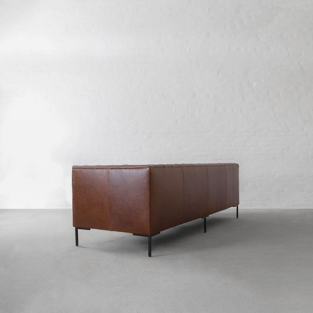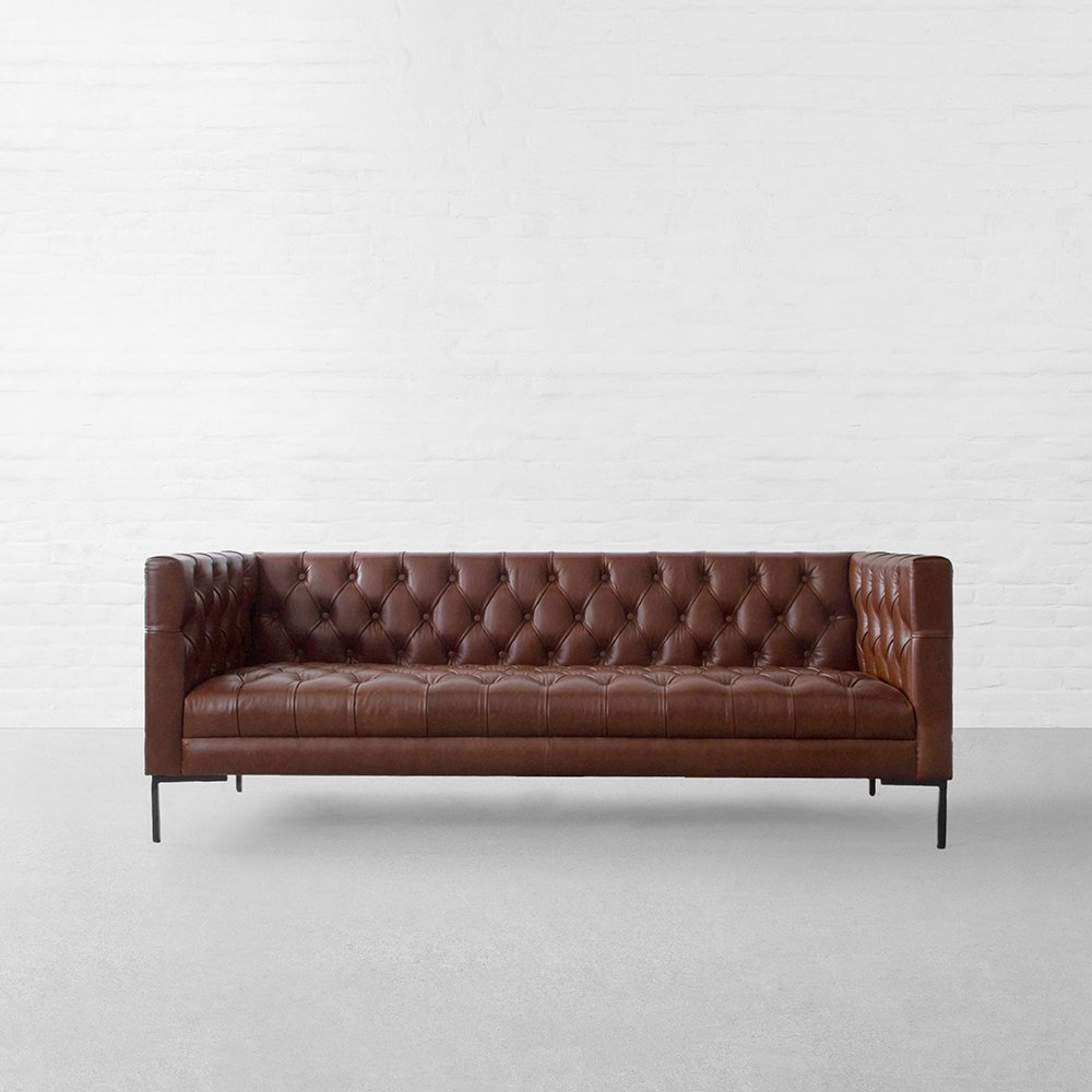 The Windsor Chesterfield 3-Seater Sofa by Art of Rajasthan features deep tufting, rich tan – brown genuine leather, and sleek black metal legs. A statement of classic elegance fused with modern edge — crafted for comfort, built to last.